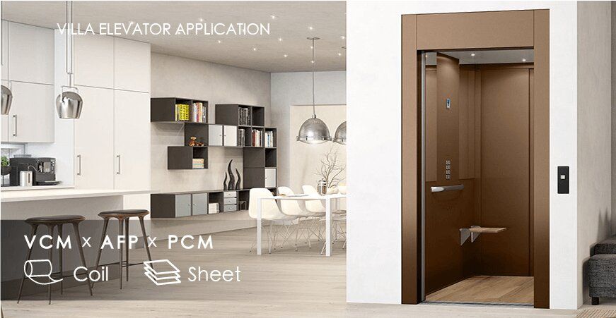 电梯行业把层压金属称为装饰钢板。许多家用电梯或商用电梯的门板通常是由高质量的层压金属制成。如果想保留金属表面的质感,还可以使用连希金属的纳米陶瓷防指纹不锈钢,疏油疏水特性,表面防指纹,易清洗,易保养,硬度可达到6H,特别适用于公共场所和商场的自动扶梯和垂直梯。各种颜色或图案的复合膜广泛应用于电梯柜、门框的门板或墙板上。